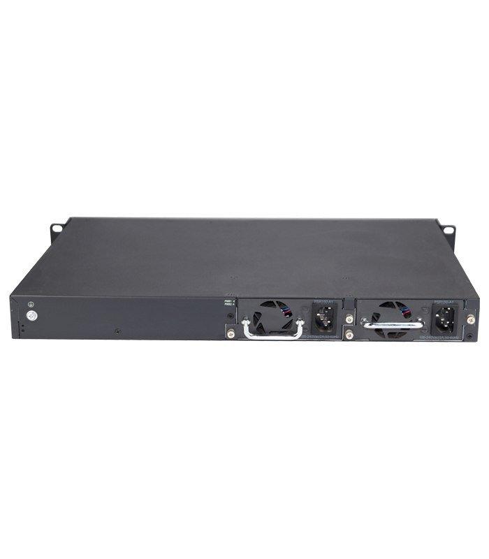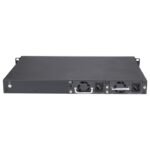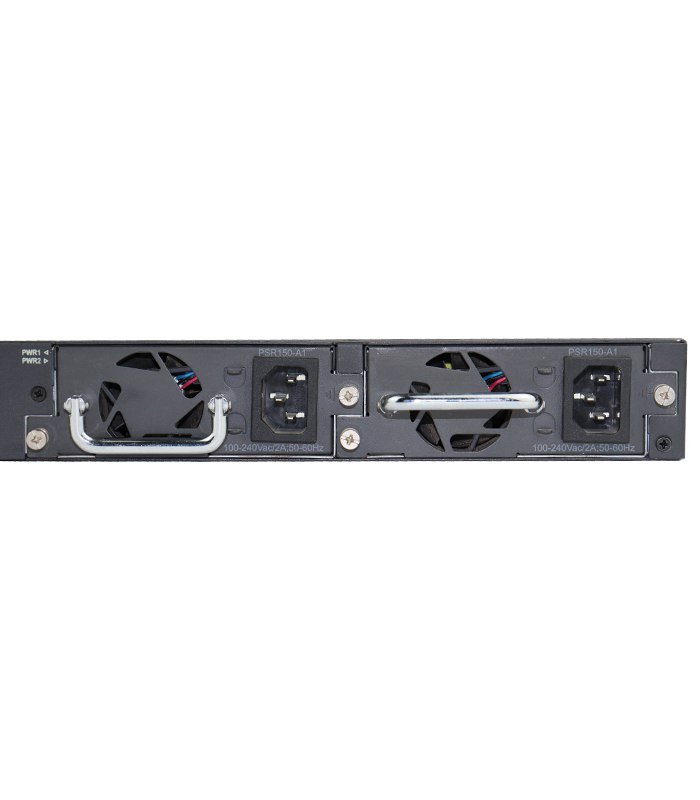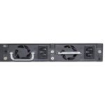 - The switch also includes replaceable dual power supply units and a fan tray module.